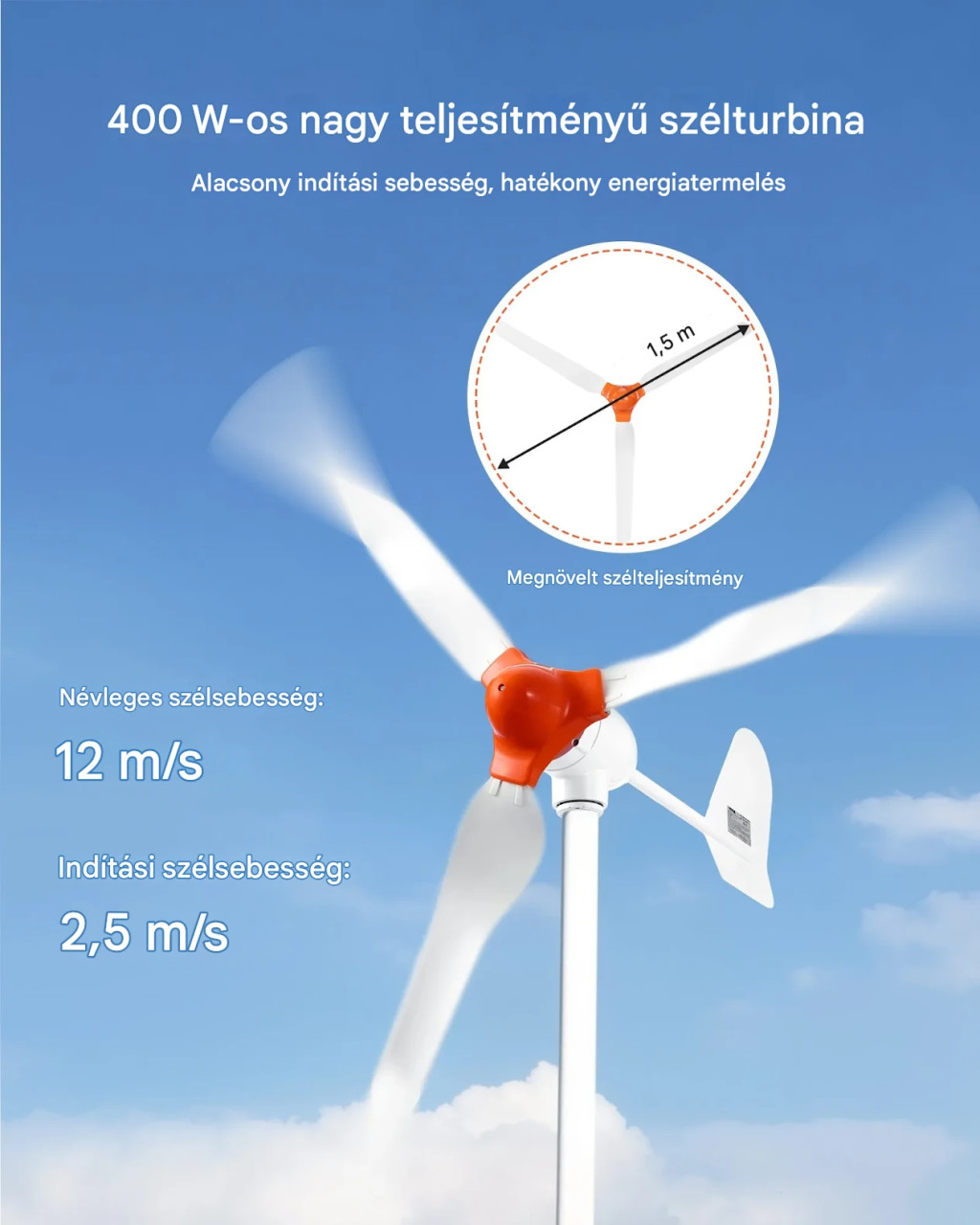 A monokristályos napelemek magas hatásfokkal működnek, míg a szélturbina már alacsony, 2,5 m/s indítási szélsebességnél is energiát termel. A rendszer így nappal és éjszaka is képes hozzájárulni az energiaellátáshoz. A fejlett hibrid vezérlés optimalizálja a töltést és védi az akkumulátort, biztosítva a hosszú távú, stabil működést.