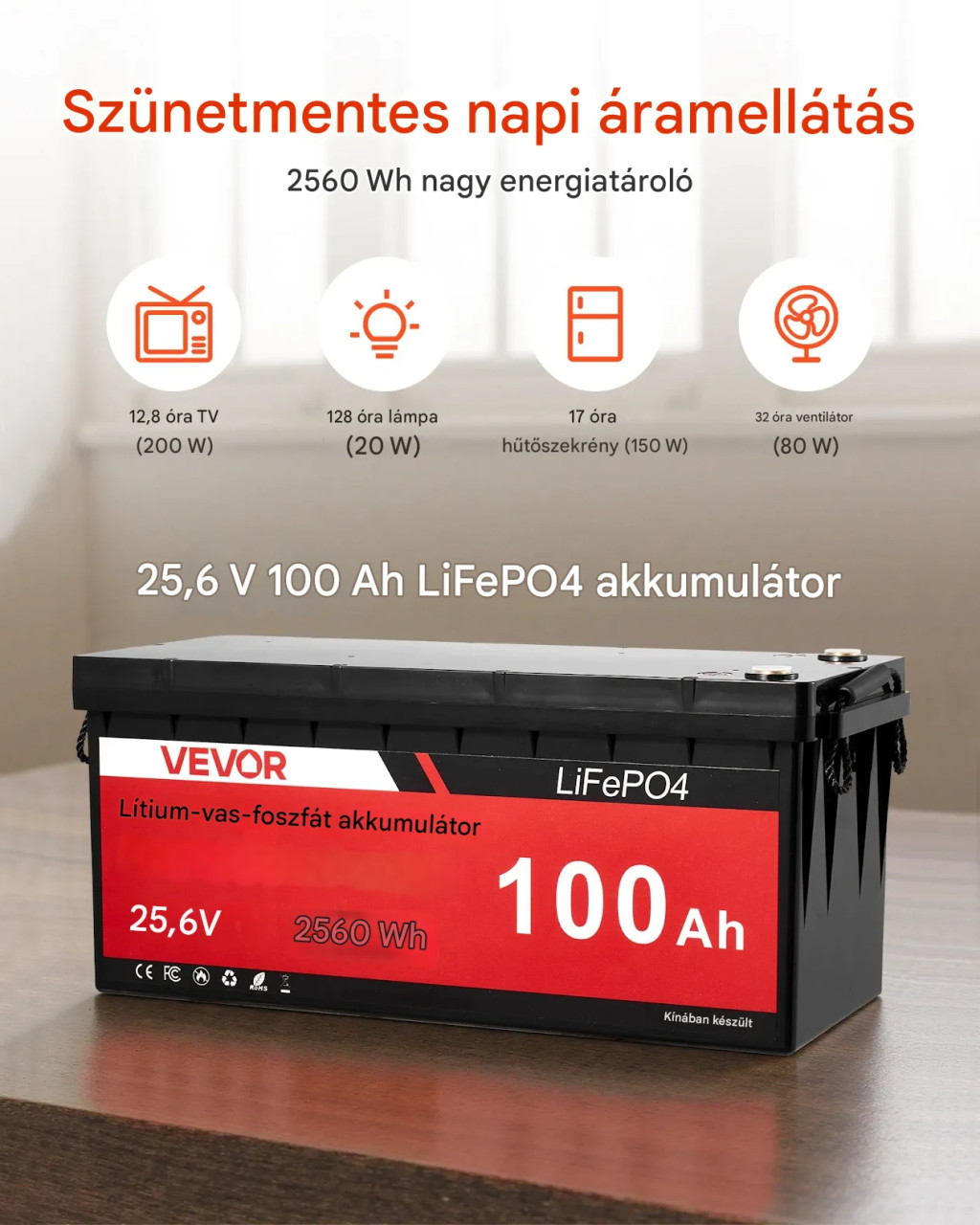 Akkumulátor kapacitás: 25,6 V, 100 Ah