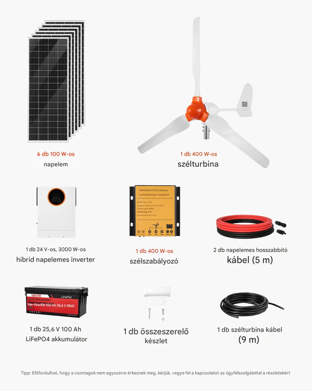 A csomag tartalmaz 6 db 100 W-os monokristályos napelemet, egy 400 W-os szélturbinát, egy nagy kapacitású 25,6 V 100 Ah LiFePO4 akkumulátort, valamint egy 3 kW-os hibrid invertert, így egy teljes, azonnal használható energiarendszert kap. Ez a kombináció lehetővé teszi az energia termelését, tárolását és felhasználását egyetlen integrált rendszerben.