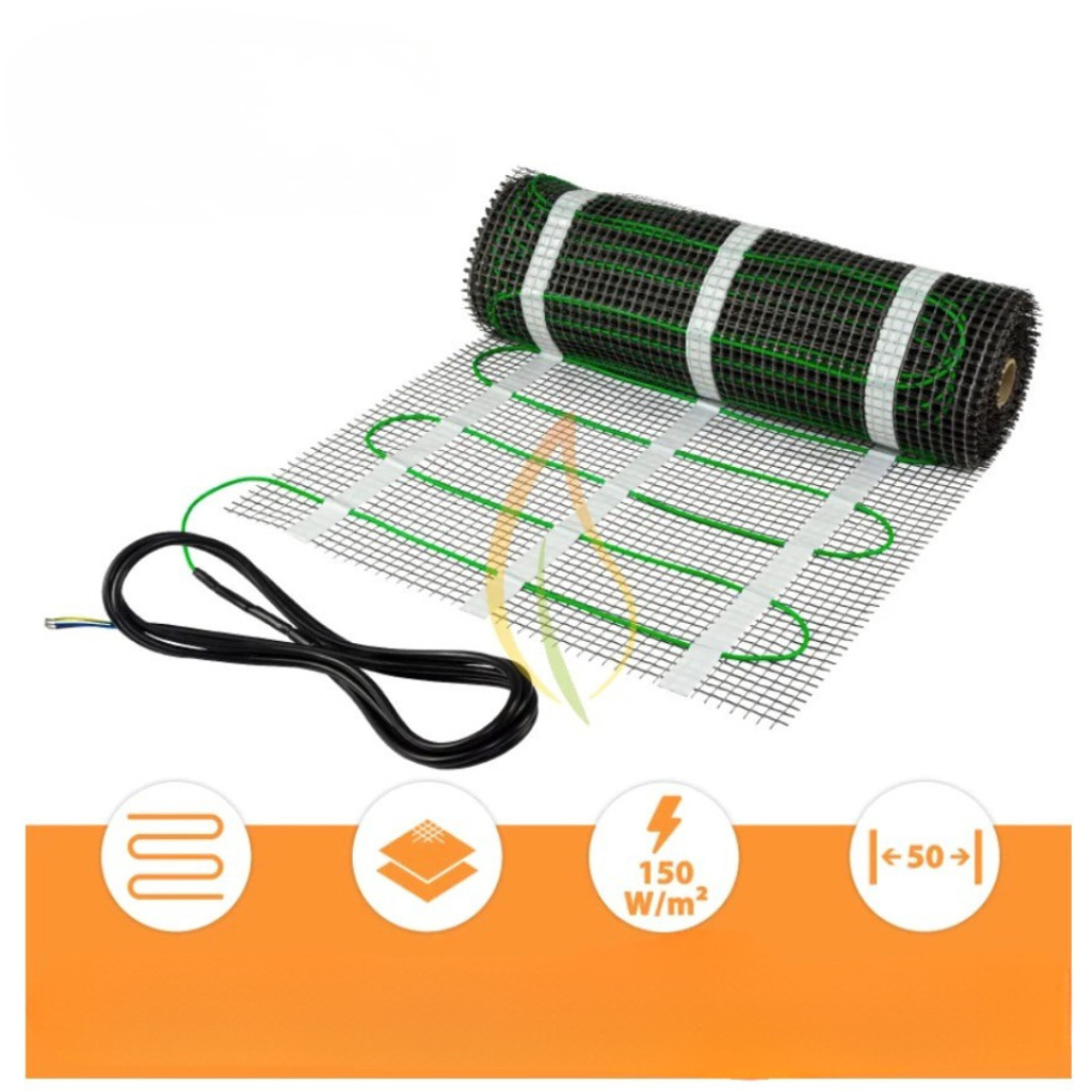 A padlófűtő szőnyeg árnyékolt kéteres fűtőkábelt használ, amely egy öntapadó hordozóhálóra van rögzítve a gyors és precíz telepítés érdekében.