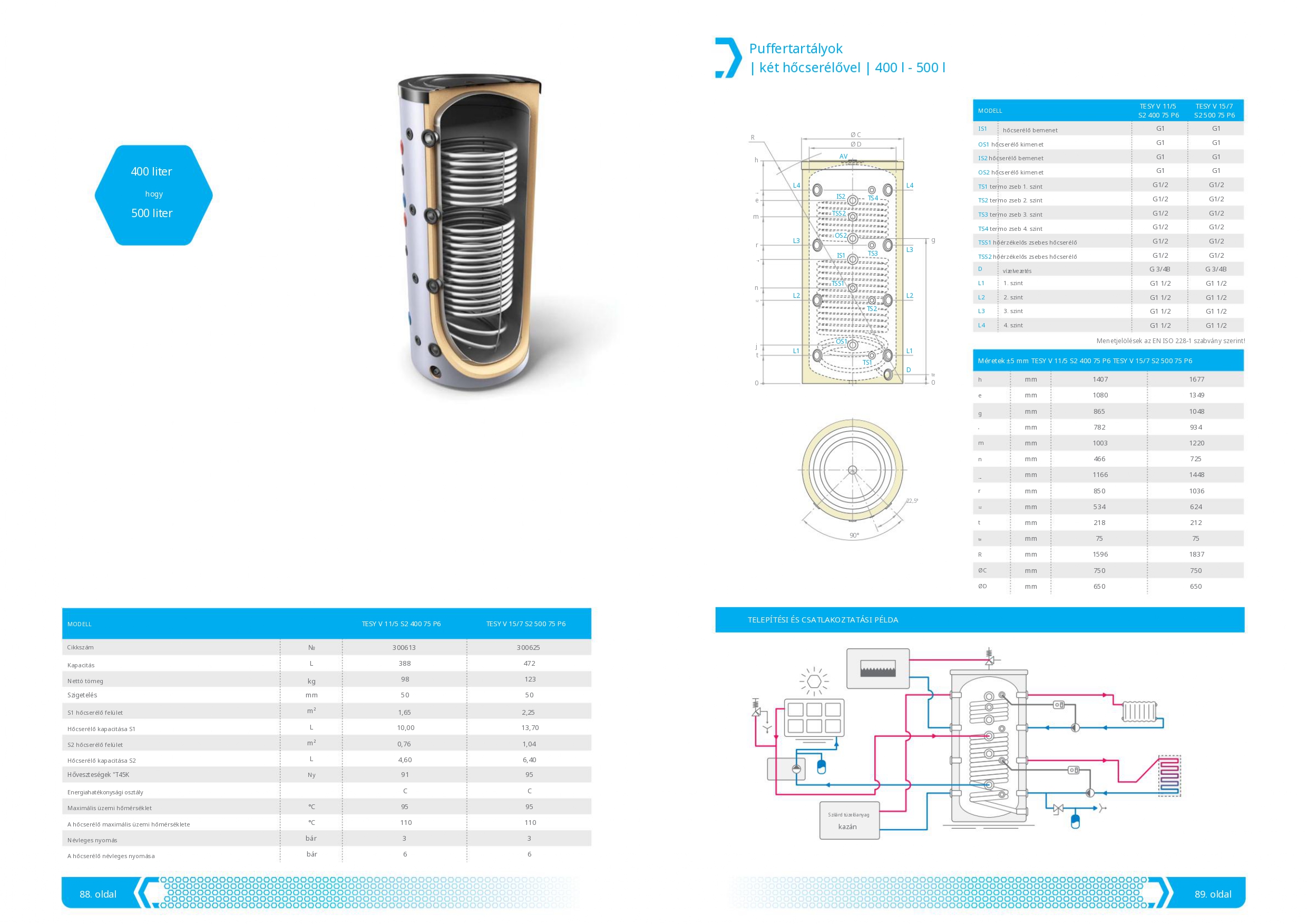 Két hőcserélős puffertartály - 400 literes tartály, melegvíz tárolás céljára 110 °C maximális üzemi hőmérséklettel