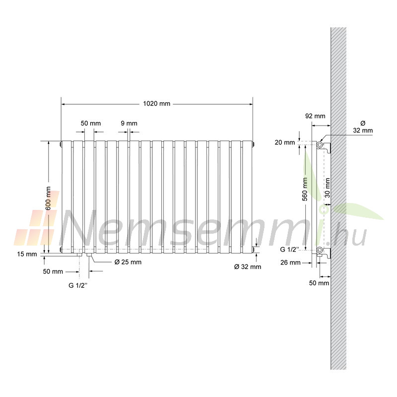 Modern design radiátor 600x1020 mm fehér bal oldali bekötés padló csatlakozó szelepcsappal