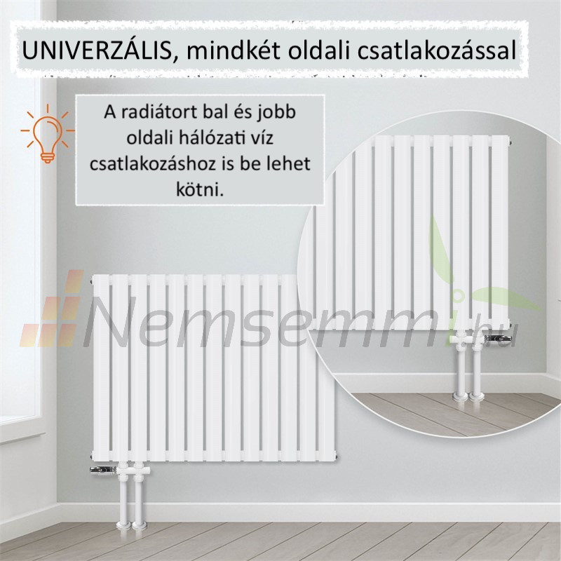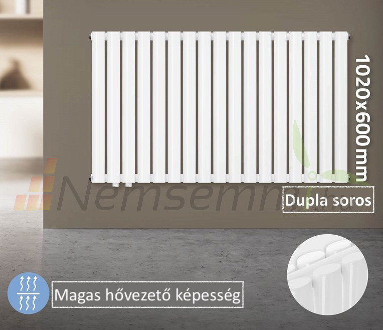 Modern design radiátor 600x1030 mm fehér dupla soros jobb és bal oldali bekötéssel fali csatlakozású szelepcsappal króm termosztáttal