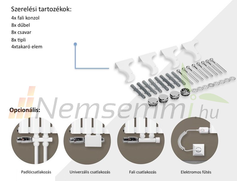 Modern design radiátor 630 x 1030 mm fehér bal oldali bekötés univerzális csatlakozó készlet