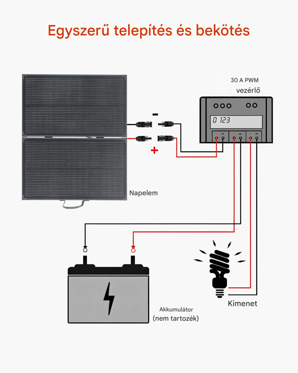 A napelem egyik legnagyobb előnye a beépített 30A PWM töltésvezérlő, amely: