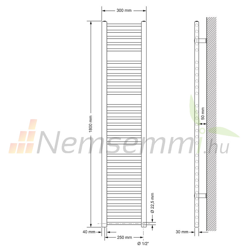 Törölközőszárító radiátor 300x1800 mm fehér 555W egysoros - egyenes változat szélső csatlakozás