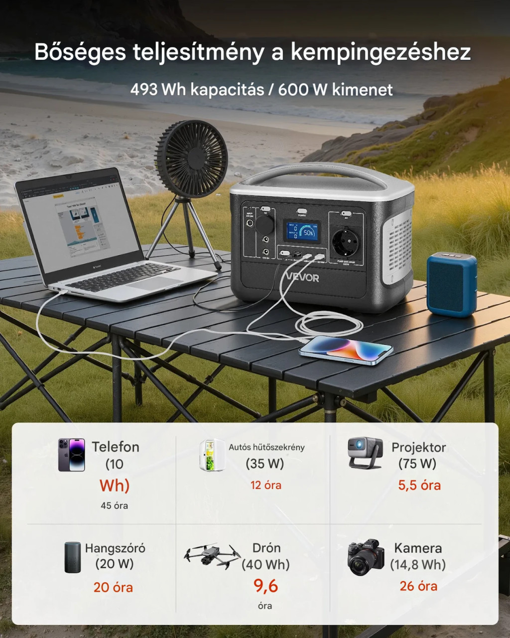 Hordozható erőmű 600W, 493Wh LiFePO4 – kompakt napelemes generátor 7 kimenettel