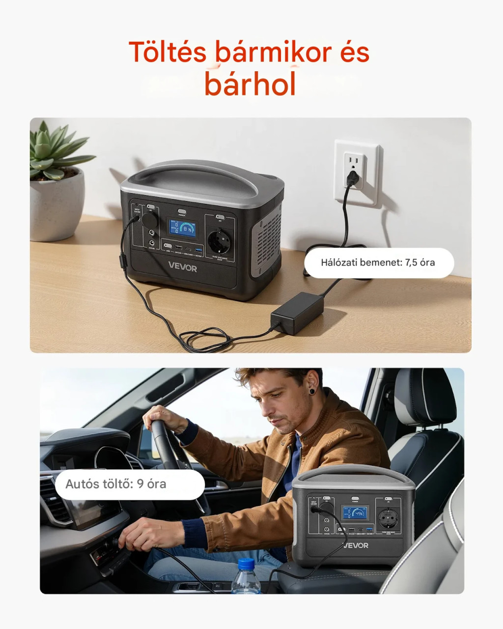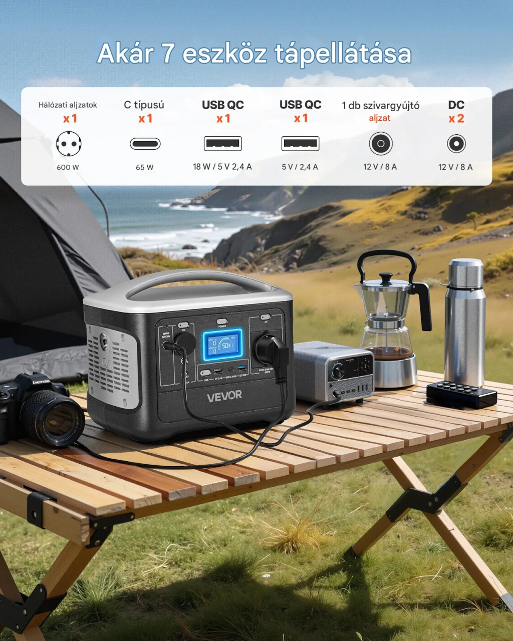 A készülék 7 különböző kimeneti porttal rendelkezik, így egyszerre több eszközt is képes kiszolgálni – például telefonokat, laptopokat, világítást vagy kisebb háztartási készülékeket.