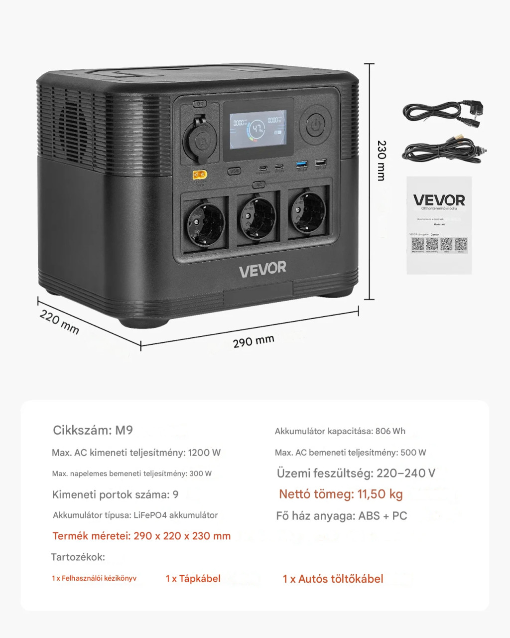 Hordozható erőmű 1200 W, 806 Wh LiFePO4 – kompakt napelemes generátor 9 kimenettel