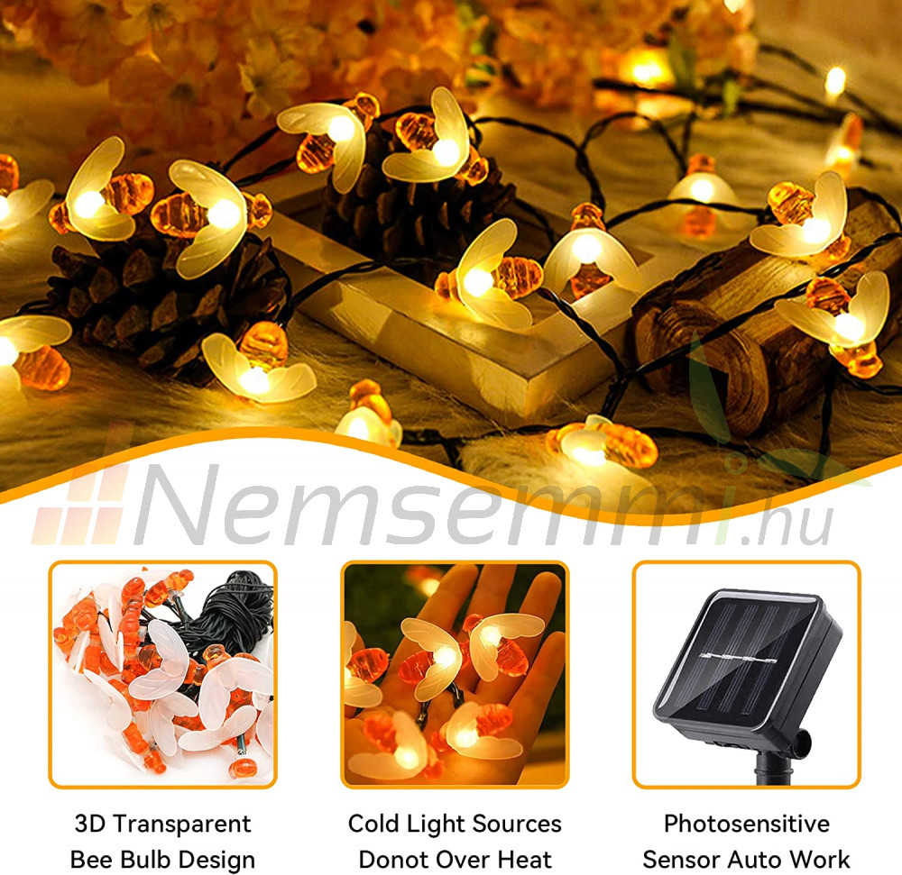 Napelemes fényfüzér 7 méter 50 db meleg fehér méhes LED kültéri világítás vízálló dekoráció