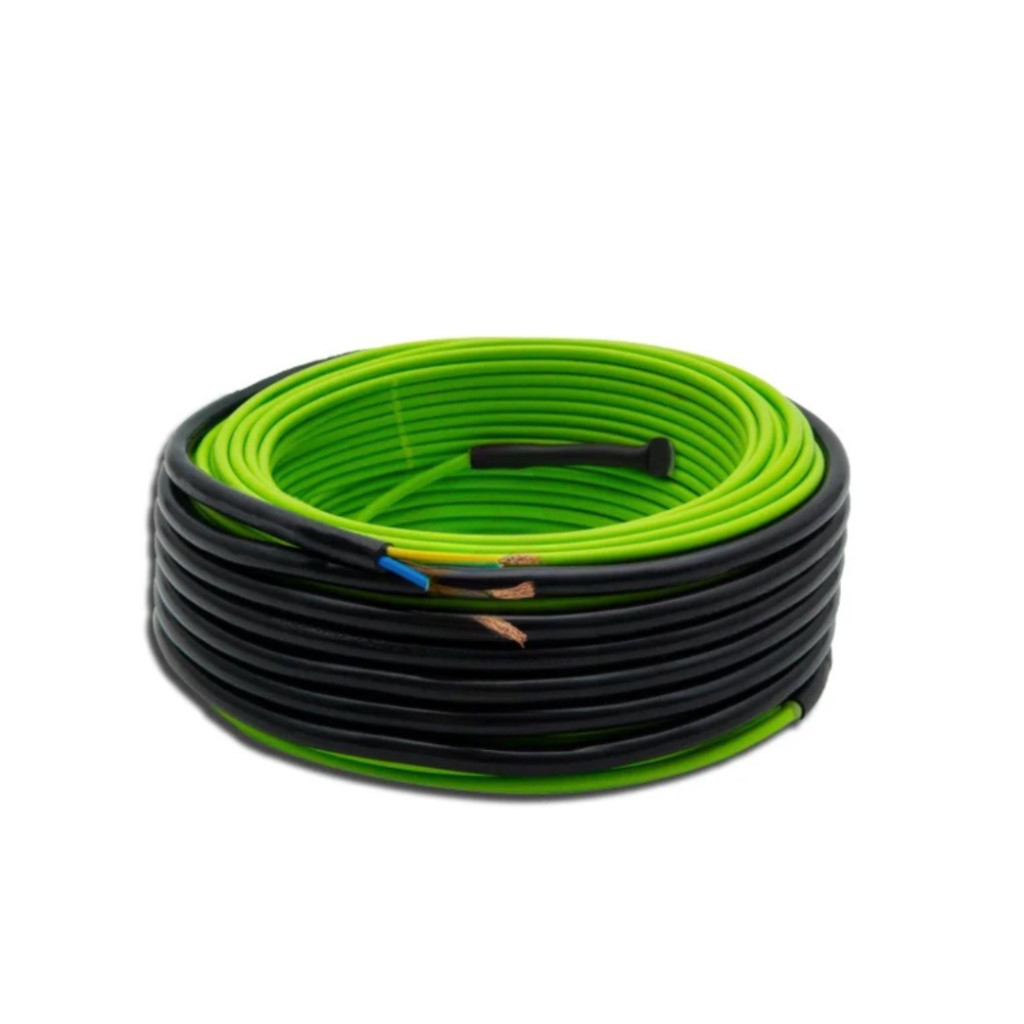 A fűtőkábel védővezető fonattal és magas IPX7 védettségi besorolással rendelkezik, ezért fürdőszobákban és más nedves helyiségekben is biztonságosan alkalmazható. Megfelelő termosztáttal kombinálva precízen szabályozható, komfortos és energiatakarékos padlófűtési rendszer alakítható ki.