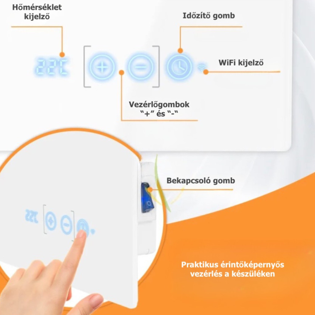 A készülék beépített termosztáttal rendelkezik, amely önállóan vagy alkalmazáson keresztül is vezérelhető. Az előlap üvegfelületén található érintőgombok lehetővé teszik a hőmérséklet gyors, intuitív beállítását. A Sundirect Smart App segítségével távolról is irányíthatja a fűtést, programozhatja az időzítést, illetve részletes hőszabályozási beállításokat végezhet.
