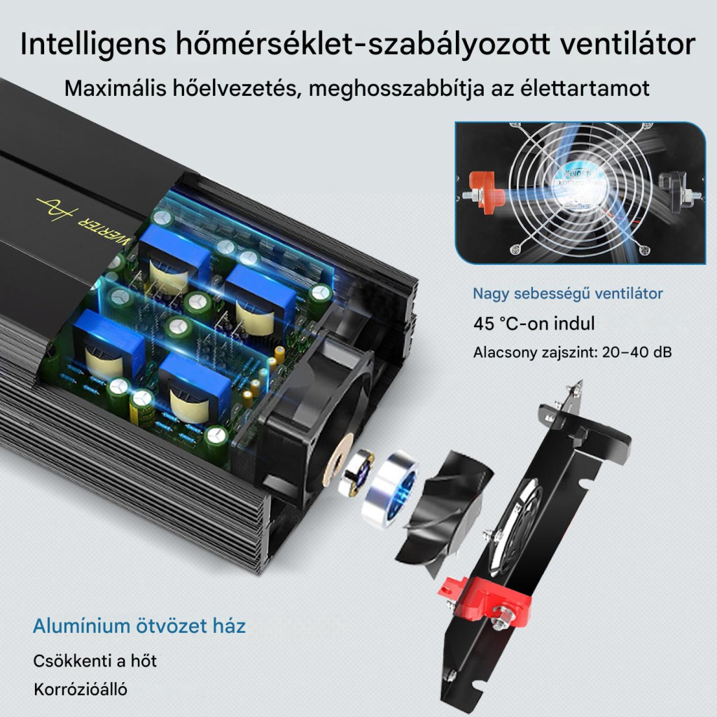 A masszív alumíniumötvözet ház hatékony hőelvezetést biztosít, az intelligens ventilátorhűtés pedig automatikusan aktiválódik a megfelelő hőmérséklet elérésekor, így biztosítva a stabil működést.