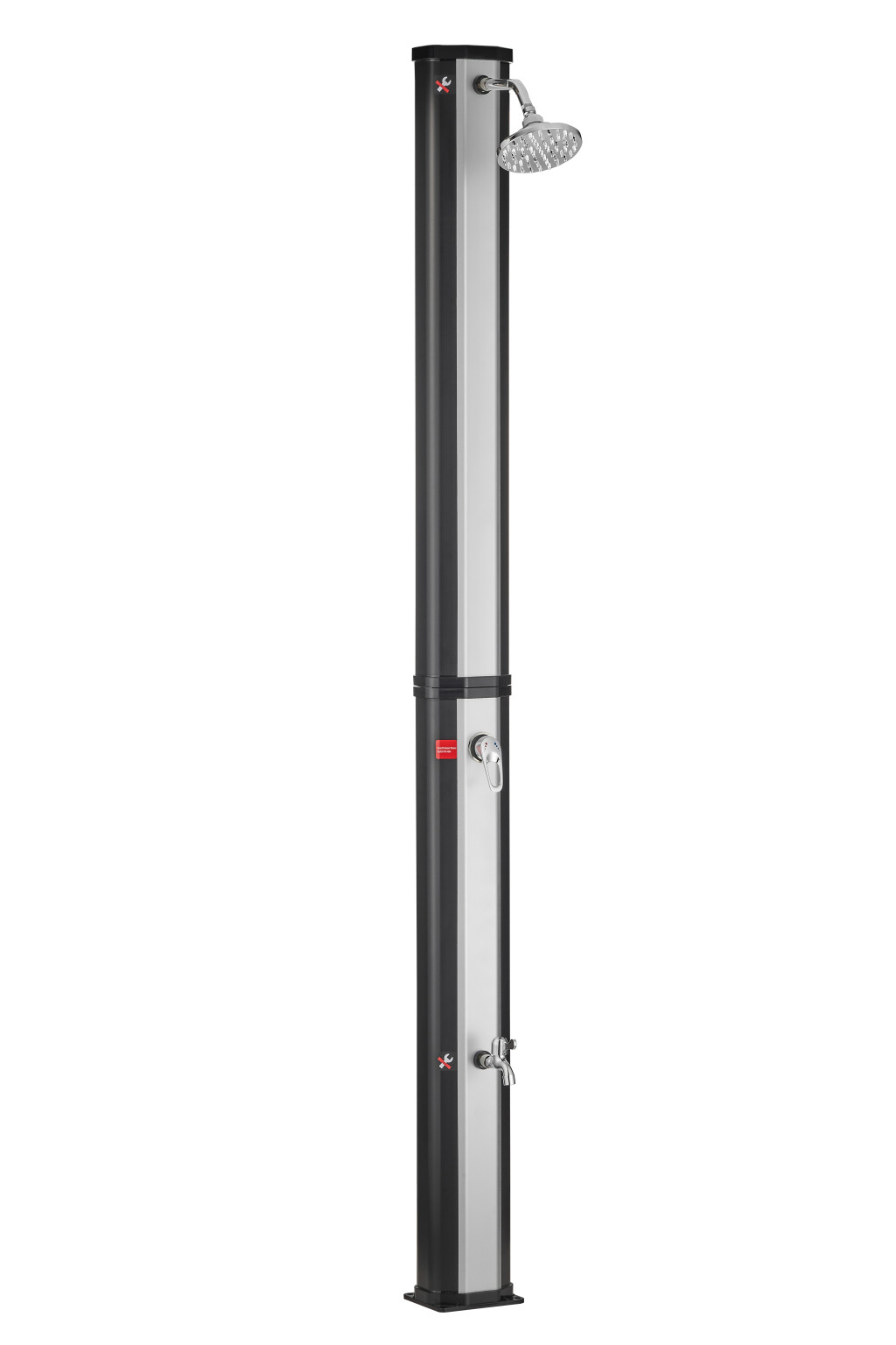 Szolár kerti zuhany, 40L, ezüst-fekete, lábzuhannyal és esőztető fejjel, PVC és krómozott ABS