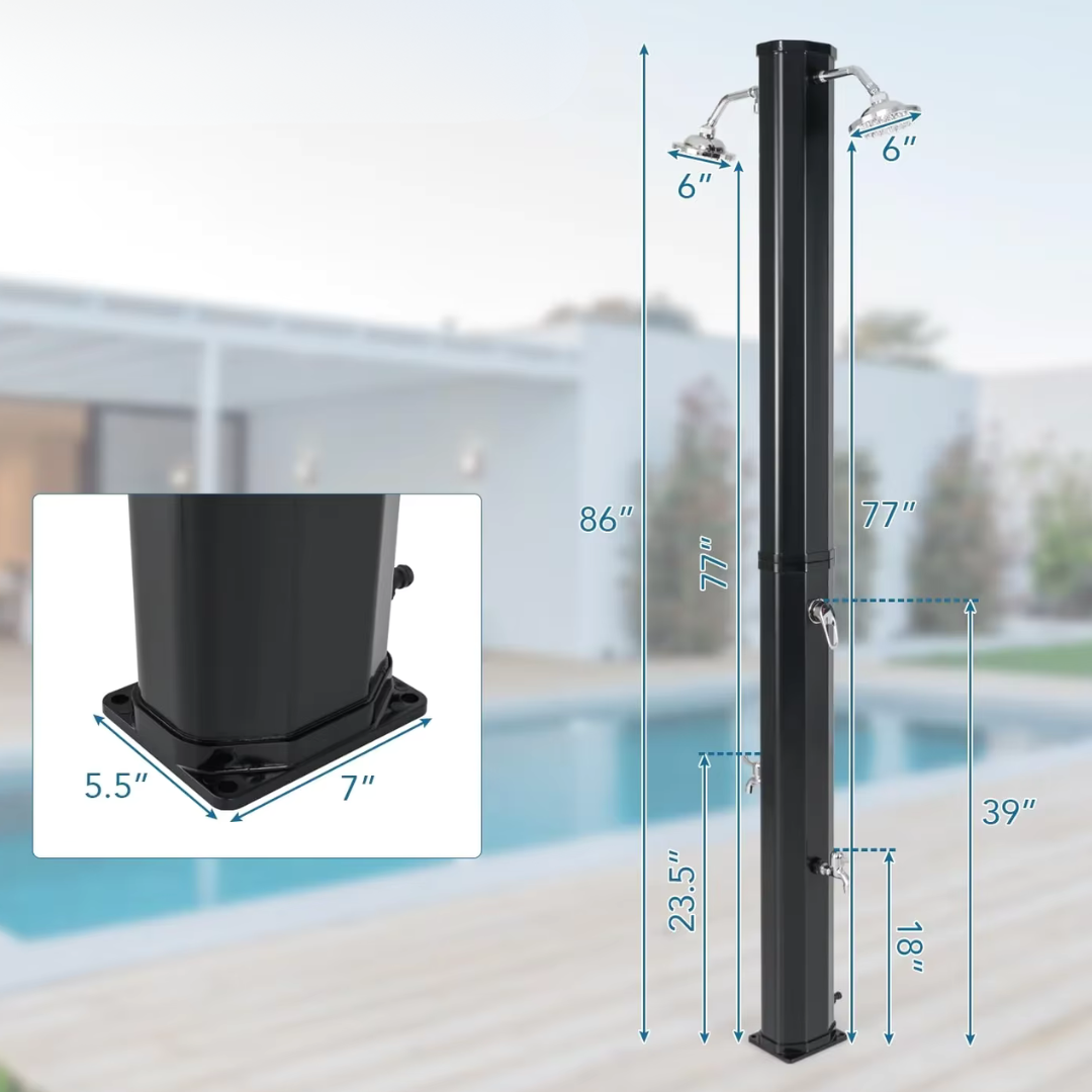 Ez az egyedülálló, két zuhanyfejes kültéri napelemes zuhany nagyobb igénybevételre lett tervezve. Két személy is tud vele egyszerre zuhanyozni, így kiváló választás medencék mellé, kempingekbe, tengerparti nyaralókba vagy családi házak kertjébe.