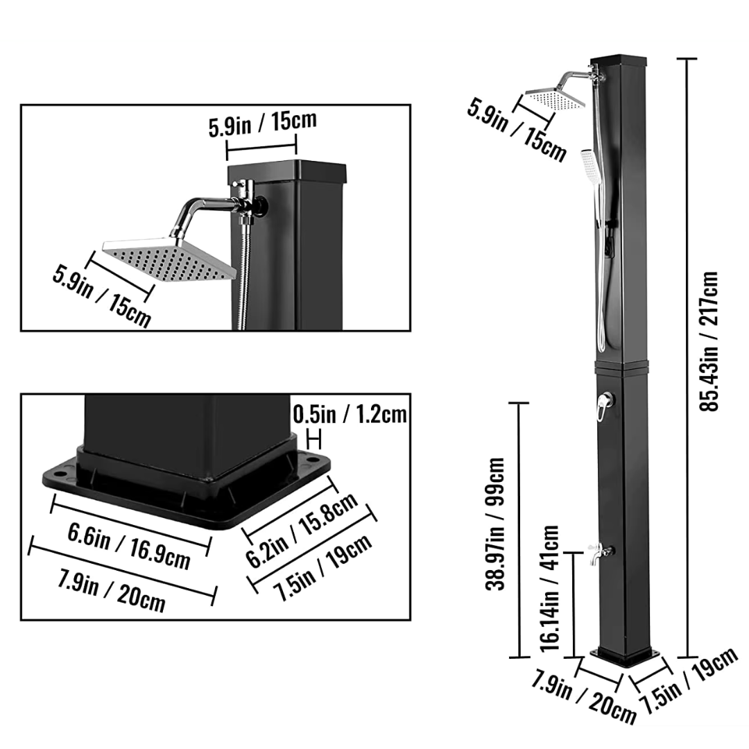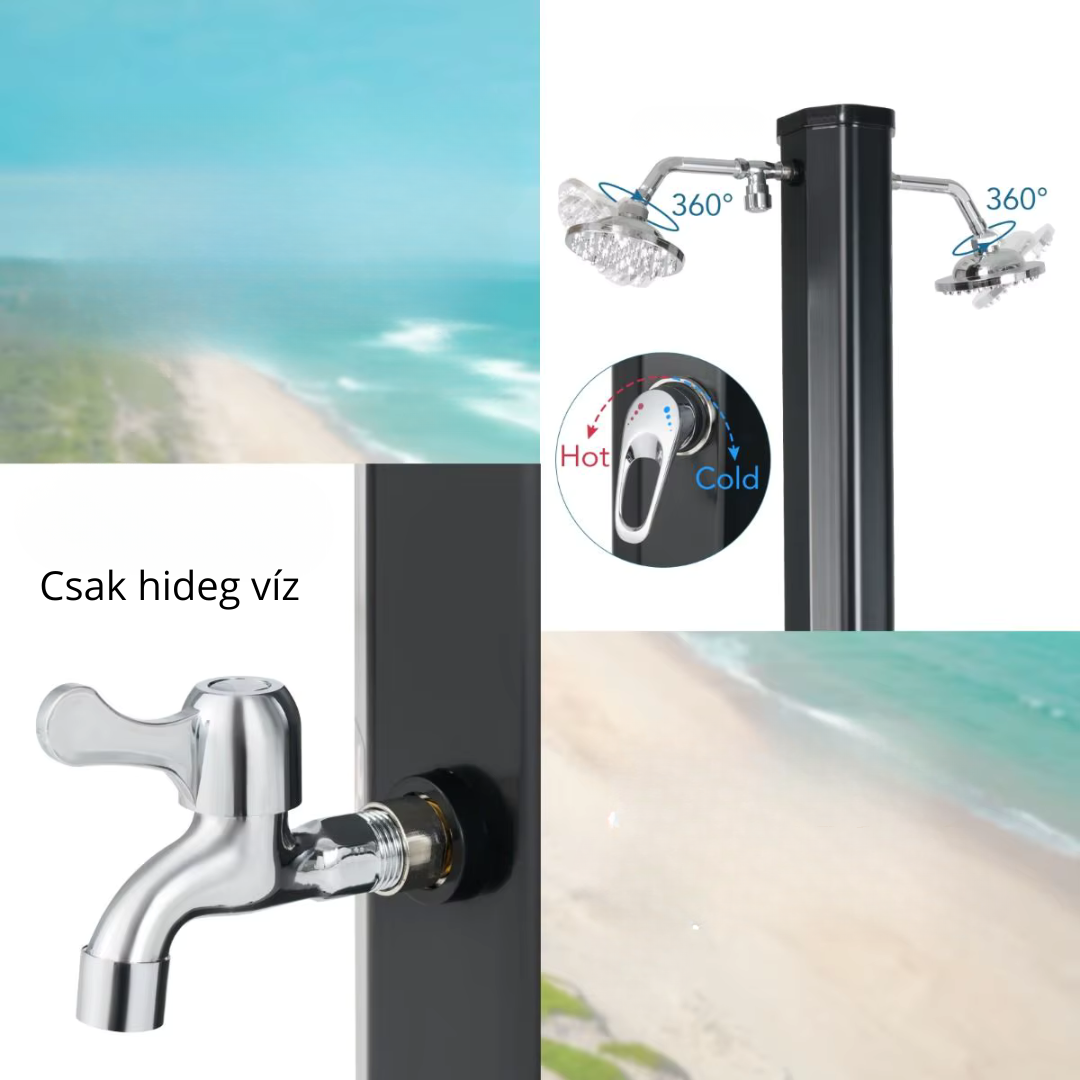 A két személy egyidejű kiszolgálására alkalmas, 60 literes, nyolcszögletű kültéri napelemes zuhany ideális választás nagyobb családoknak, medencetulajdonosoknak vagy olyan helyszínekre, ahol gyakran van szükség gyors tisztálkodásra. A készülék napenergiával működik, így a teljes víztartályt akár 60 °C-ra felmelegíti, elektromos energia nélkül. A robusztus PVC test, a dupla krómozott ABS zuhanyfej, valamint a két darab cinkötvözet lábmosóavó rendkívül praktikus és kényelmes használatot biztosít. A modern fekete–ezüst megjelenés prémium külsőt kölcsönöz bármely kertben vagy medence mellett.