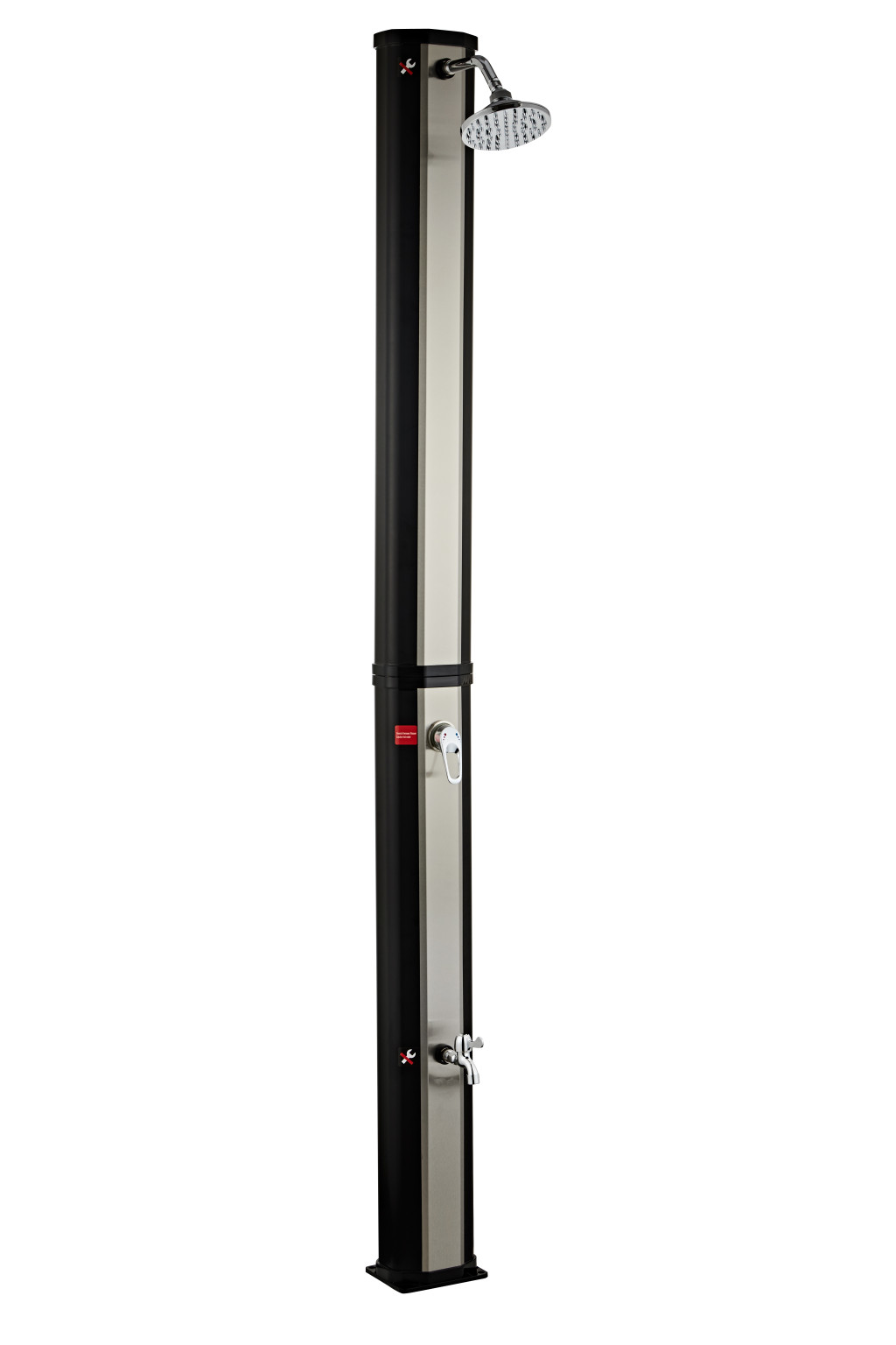 Szolár kerti zuhany 60 liter, nikkel-fekete szín, lábmosócsappal és esőztető fejjel, PVC és szálcsiszolt nikkel