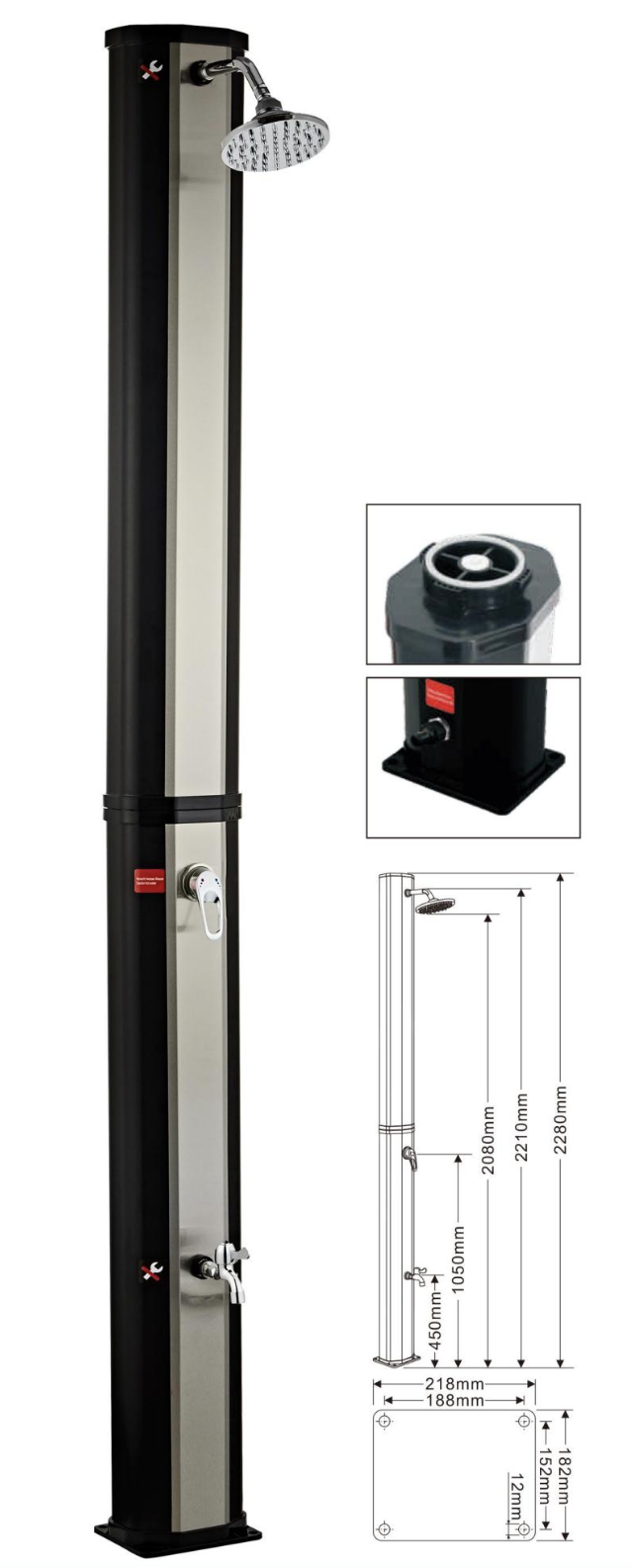 Ez a zuhany bárhol gyorsan telepíthető, nem igényel elektromos hálózatot, működése pedig teljesen ingyenes, hiszen a 35 literes víztartályt kizárólag napenergia fűti fel. Kiváló választás medencék mellé, mivel segít eltávolítani a naptejet, homokot vagy a klóros vizet, mielőtt újra bemenne a vízbe. A masszív PVC + ABS szerkezet a kültéri használatra lett tervezve, így hosszú távon is megőrzi stabilitását és esztétikus megjelenését.
