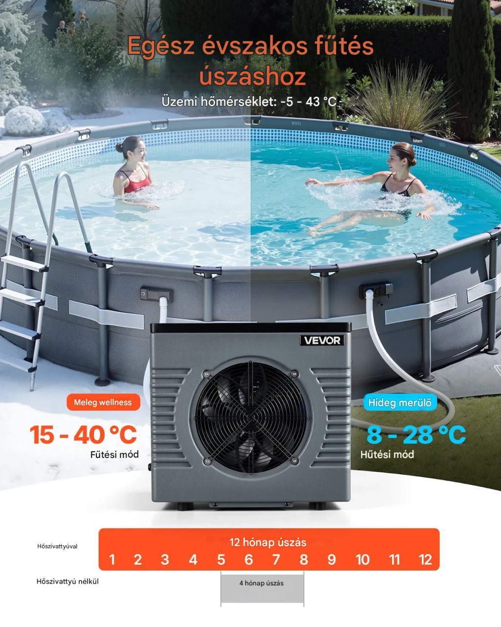 Ez a medence hőszivattyú kiváló választás mindazok számára, akik kompakt méretben keresnek megbízható, energiatakarékos és biztonságos megoldást.