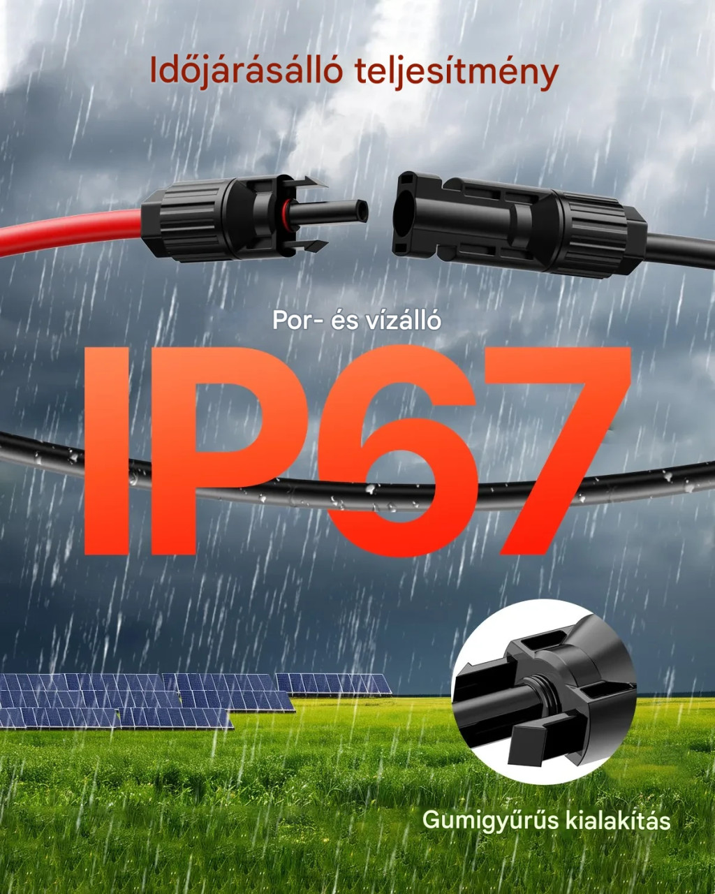 A kábel MC4 kompatibilis apa és anya csatlakozókkal rendelkezik, így szerszámok nélkül, gyorsan csatlakoztatható a legtöbb napelemes rendszerhez.