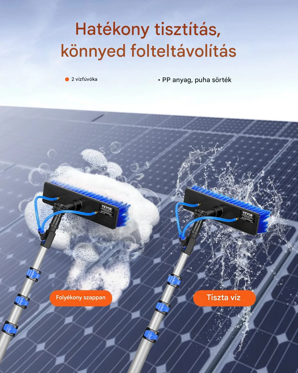 teleszkópos mosókefe teleszkópos nyéllel, 9 m hosszú tisztítórúddal, 180°-ban forgó kefefejjel és 20 m tömlővel, ablaktisztító eszköz háztartási használatra és lakókocsi napelemes teraszokhoz
