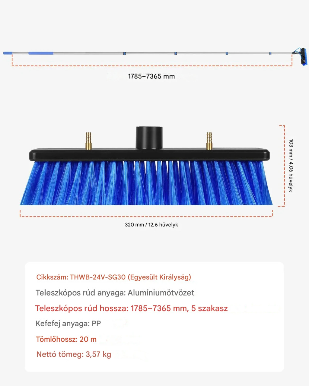 Teleszkópos mosókefe 7,3 m hosszúságig kihúzható nyéllel és 20 m tömlővel 180 fokban állítható fejjel napelemek és kültéri felületek tisztításához
