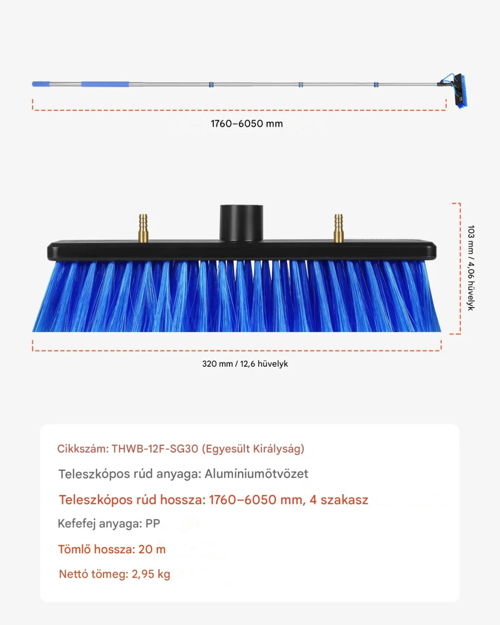 Teleszkópos mosókefe 6 m hosszúságig kihúzható nyéllel és 20 m tömlővel 180 fokban állítható fejjel napelemek és kültéri felületek tisztításához