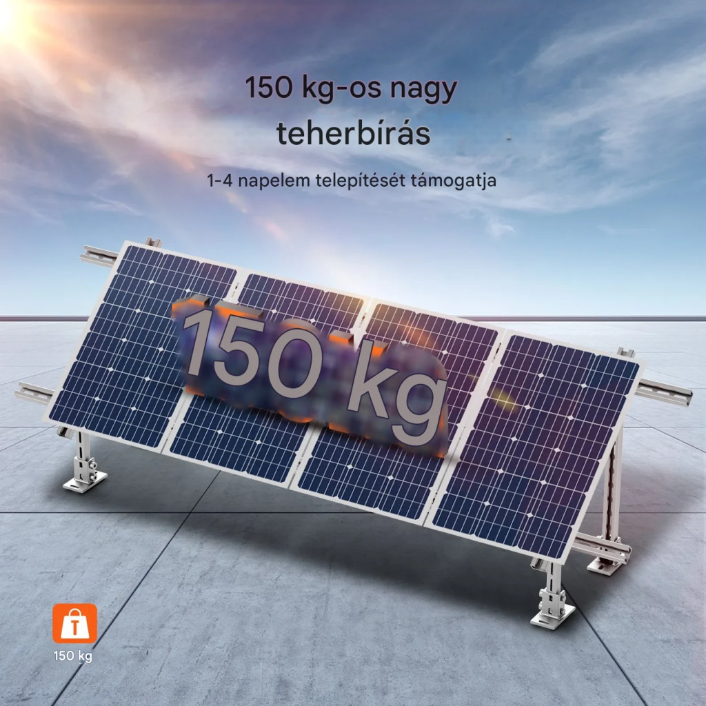 A tartó nagy szilárdságú szénacélból készült, amely biztosítja a hosszú élettartamot és a stabil működést. A konstrukció akár 150 kg terhelést is elbír, így biztonságosan tartja a napelemeket még kedvezőtlen időjárási körülmények között is.