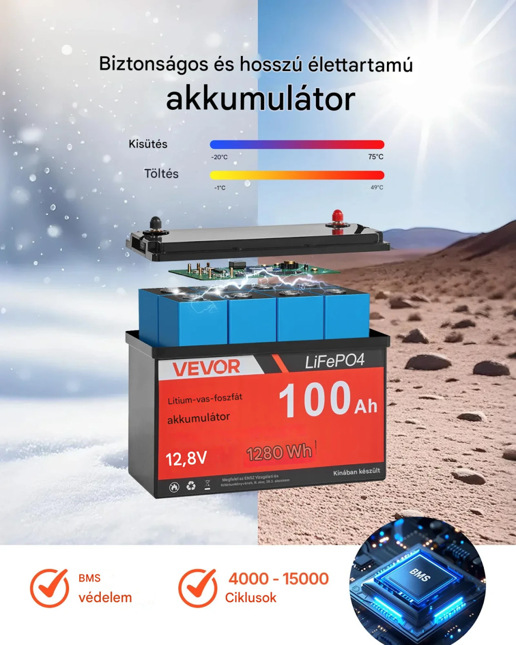 • Akkumulátor: 12,8 V / 100 Ah LiFePO₄