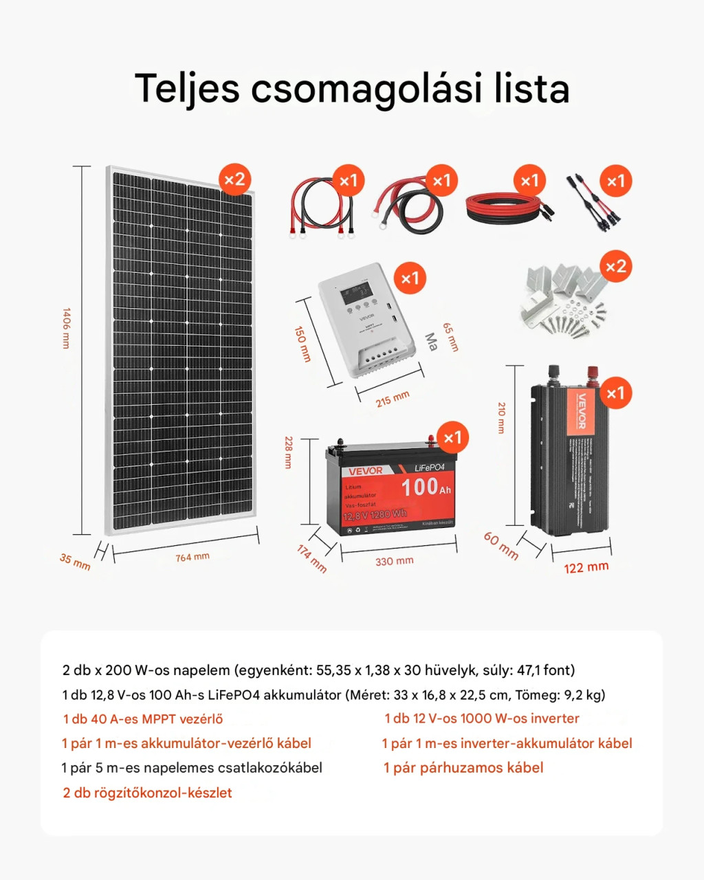 400W 12V-os napelem komplett szett, 2 db 200W-os monokristályos napelem + 12,8V 100Ah LiFePO₄ akkumulátor + 40A MPPT töltésvezérlő + 1000W-os inverter lakókocsikhoz, otthonokhoz, kempingezéshez, hajókhoz, hálózaton kívüli használatra