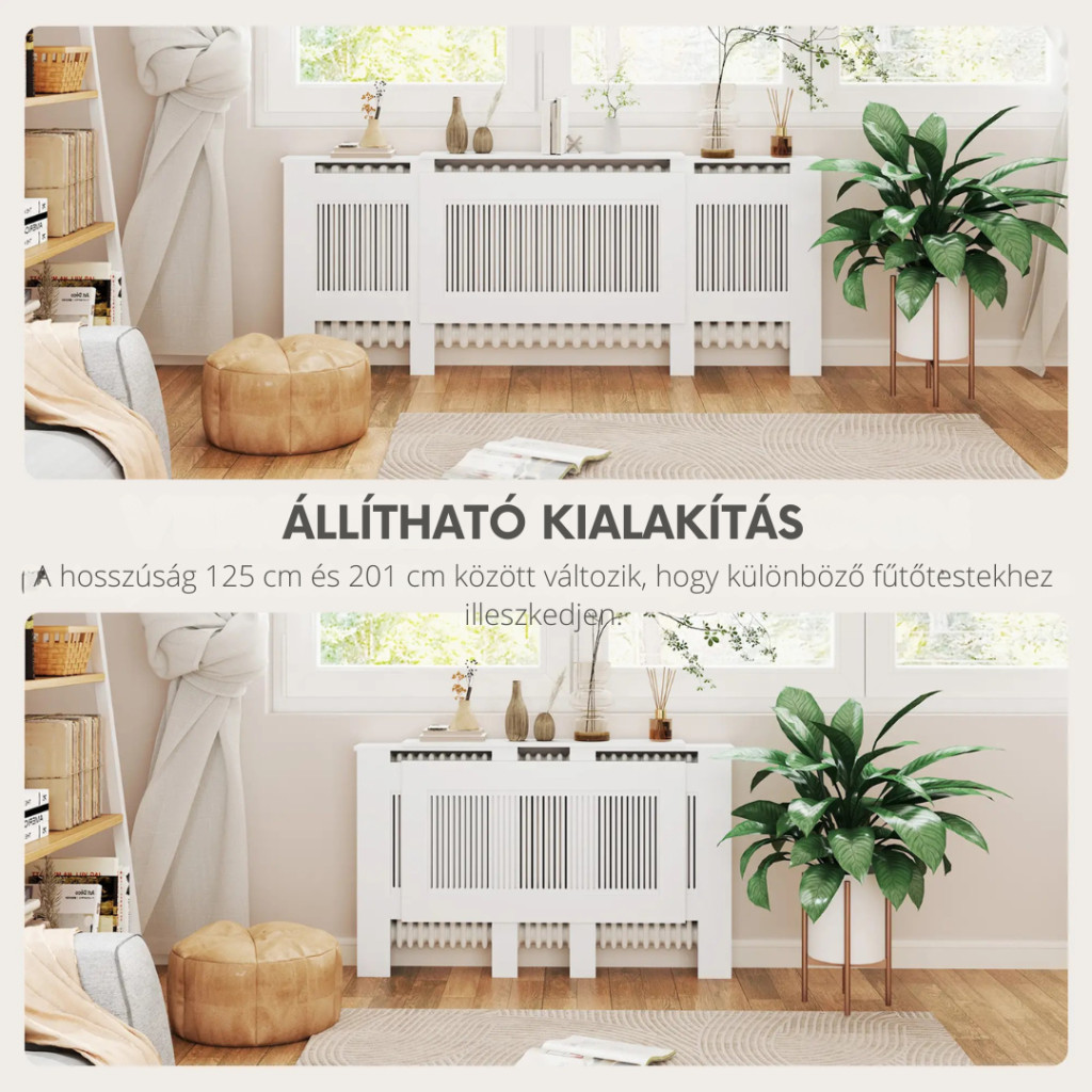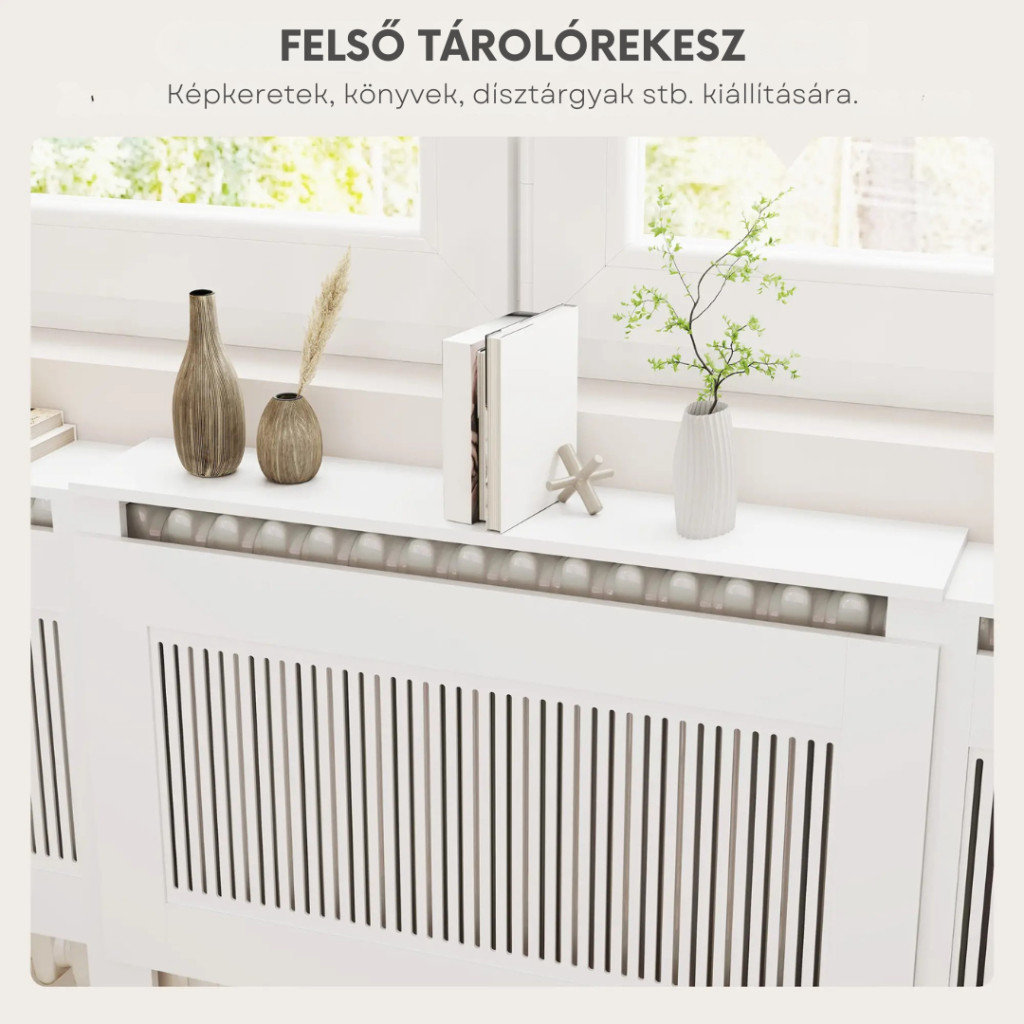 A radiátorburkolat mögött pillanatok alatt eltűntetheti a radiátort, így sokkal dekoratívabbá teheti nappaliját. A fűtőtest burkolata fehérre lakkozott MDF-lemezekből készül, így hosszú élettartamot biztosít. Elegáns és egyszerű megjelenésű. A jó szellőzés és a hatékony hőáramlás biztosítása érdekében az elülső rész lamellás.