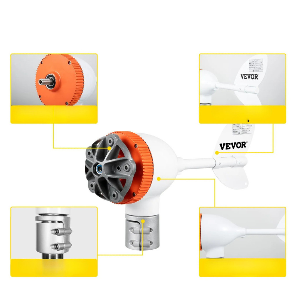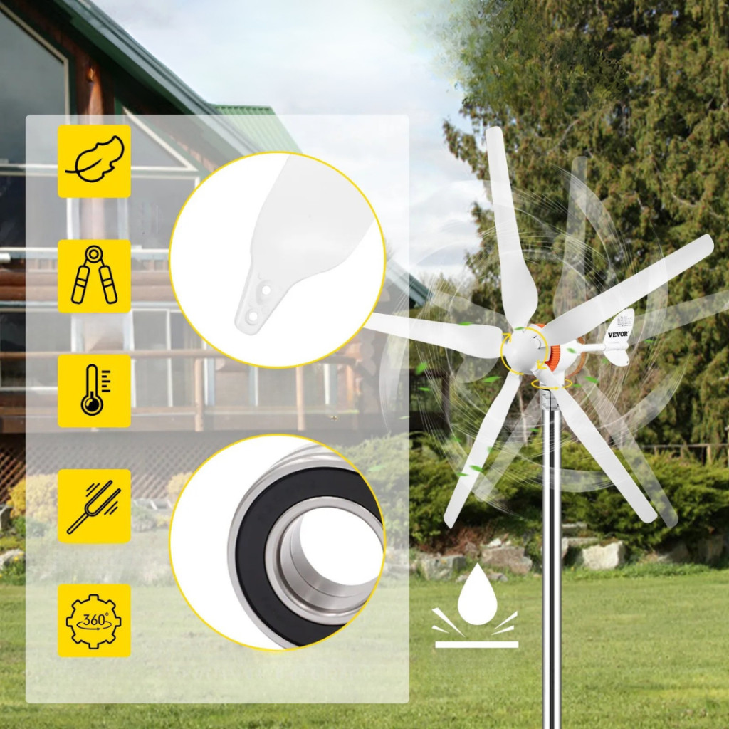 Az 5 lapátos rotor kialakítás stabil működést és jó hatásfokot biztosít, míg a beépített MPPT töltésvezérlő segít optimalizálni az energiatermelést és hatékonyan tölteni az akkumulátorokat. A turbina már alacsony, 2 m/s szélsebességnél is elindul, így változó szélviszonyok mellett is képes energiát termelni.