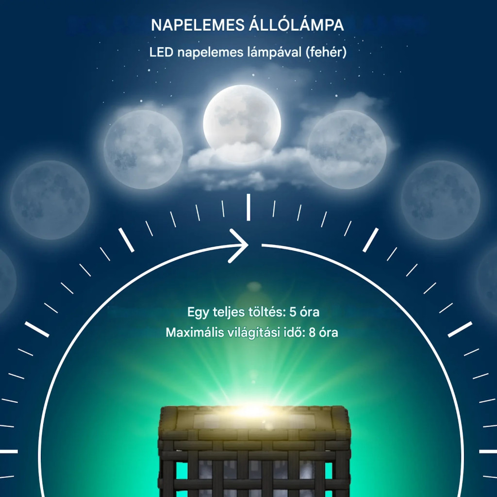 Ez a napelemes rattan lámpa tökéletes megoldás mindazok számára, akik energiatakarékos, automatikusan működő és esztétikus kültéri világítást keresnek.