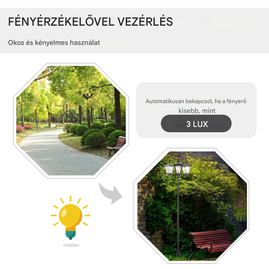 • Vezérlés: automatikus fényérzékelő + manuális kapcsoló