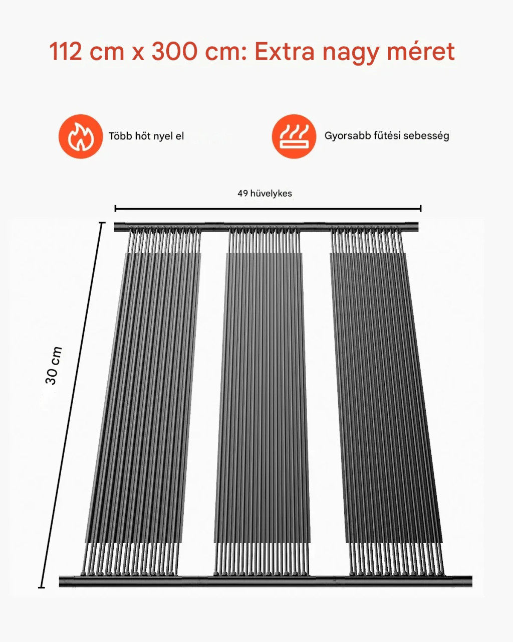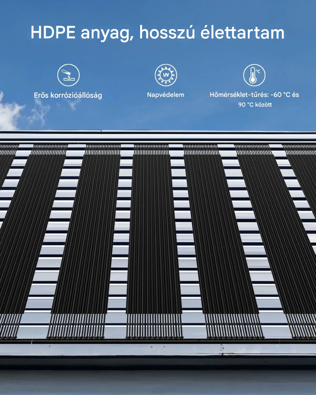 A panel UV-álló HDPE anyagból készült, amely ellenáll a napsugárzásnak, a medence vegyszereinek és a kültéri környezet hatásainak. A fekete szín segíti a hőelnyelést, így a rendszer hatékonyan alakítja át a napenergiát hővé.