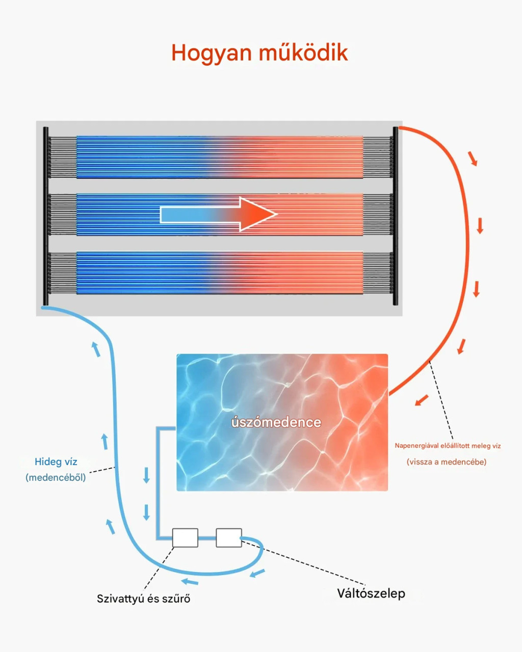 A működés során a medence vize a panelen keresztül áramlik, ahol a napenergia felmelegíti, majd visszakerül a medencébe. Ez a folyamat folyamatosan növeli a víz hőmérsékletét, teljesen energiahatékony és fenntartható módon.