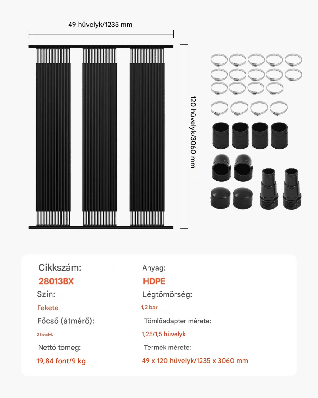 napkollektoros medencefűtő, 1235x3060 mm HDPE medencefűtő rendszer, napelemes fűtőberendezés komplett tartozékokkal, univerzális napelem, fűtőburkolat föld feletti és földbe süllyesztett medencékhez