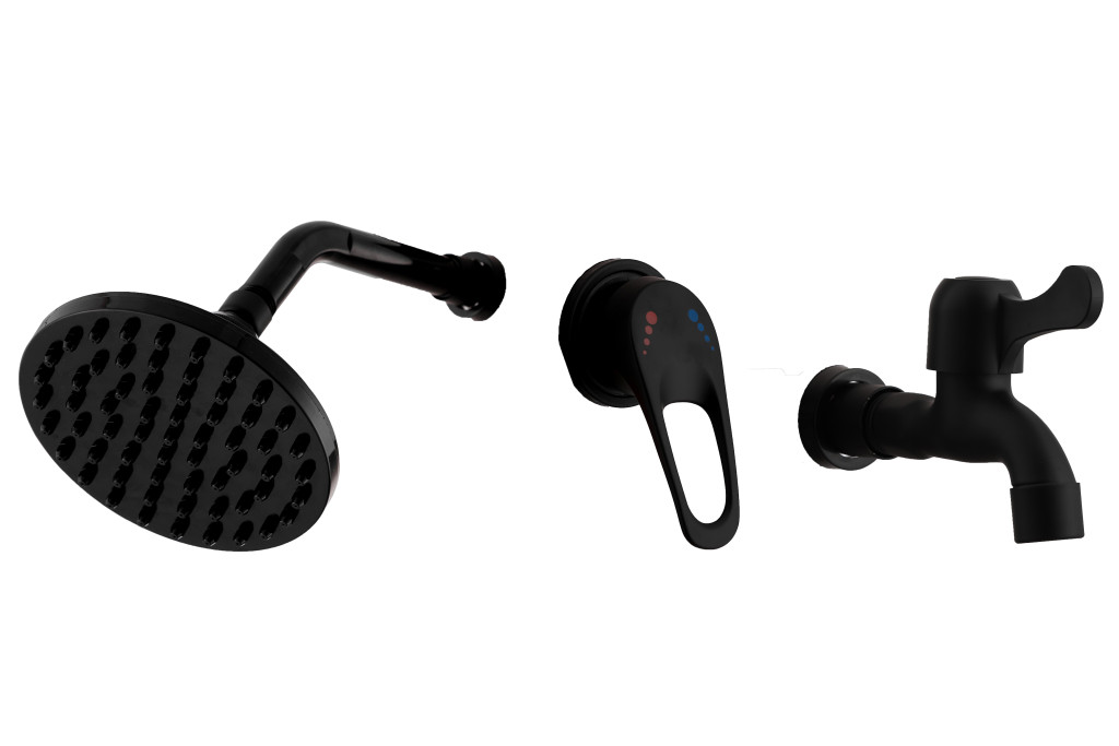 Matt fekete szolár zuhany alkatrész készlet – 15×15 cm ABS zuhanyfej karral, keverőkar és lábmosó csap