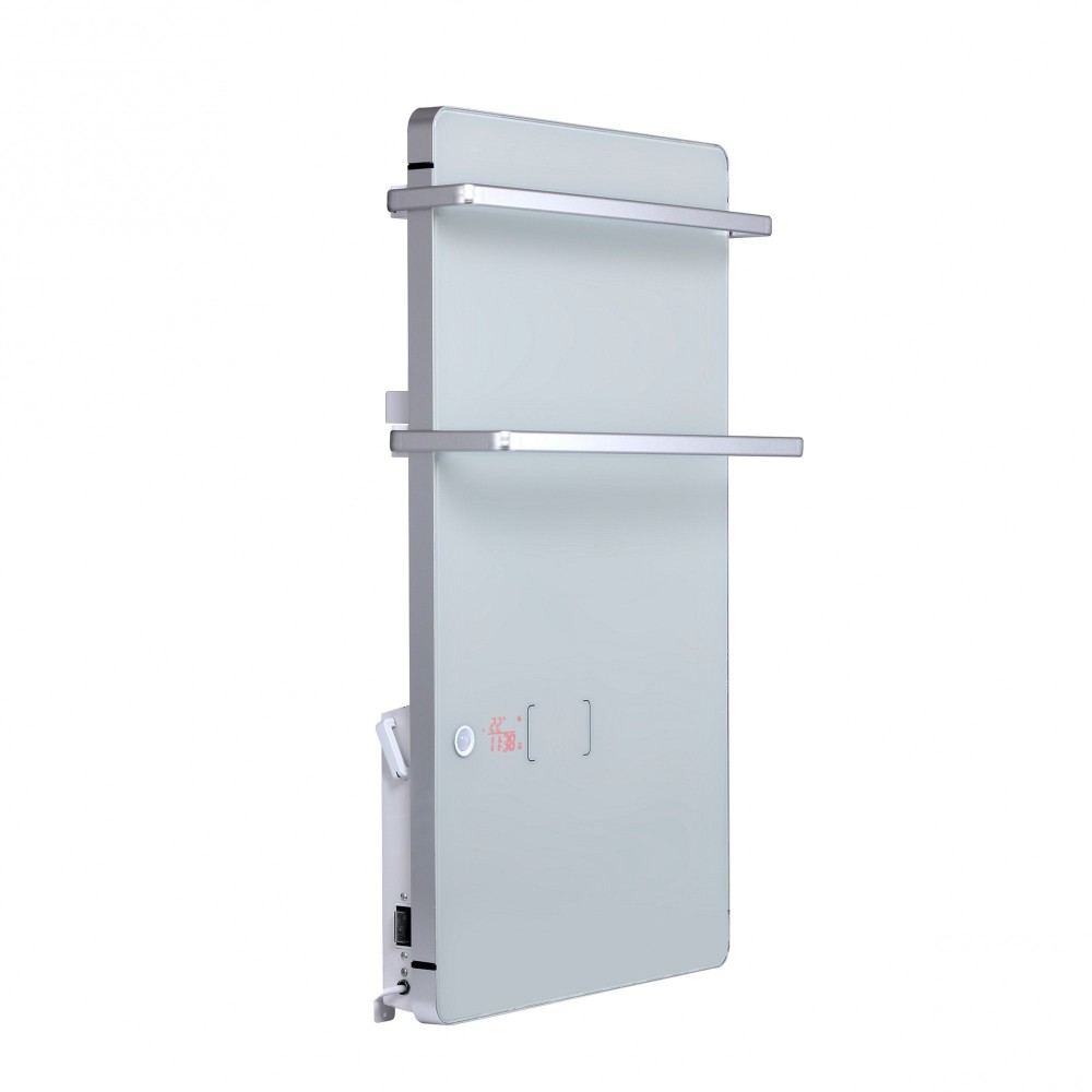 INGYEN SZÁLLÍTÁSSAL! Elektromos törölköző szárító üvegpanel 200 + 1800W teljesítménnyel törölköző szárítós radiátor. Elegáns fehér kivitel mozgásérzékelő, LED kijelző, programozható