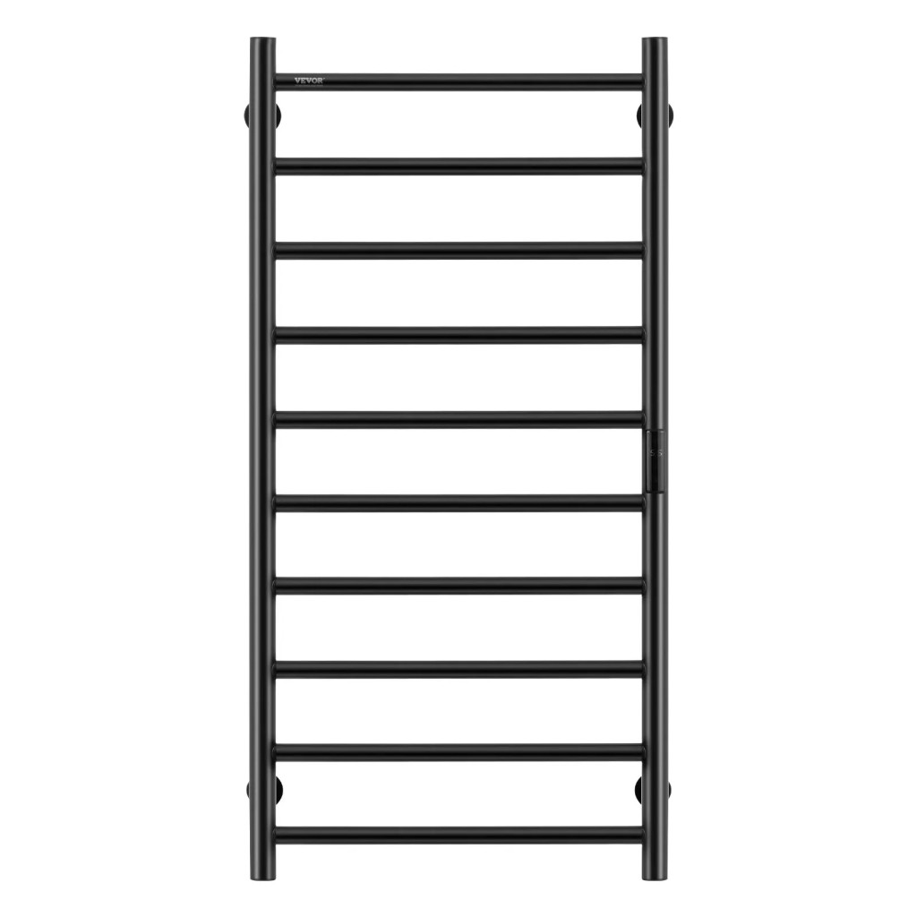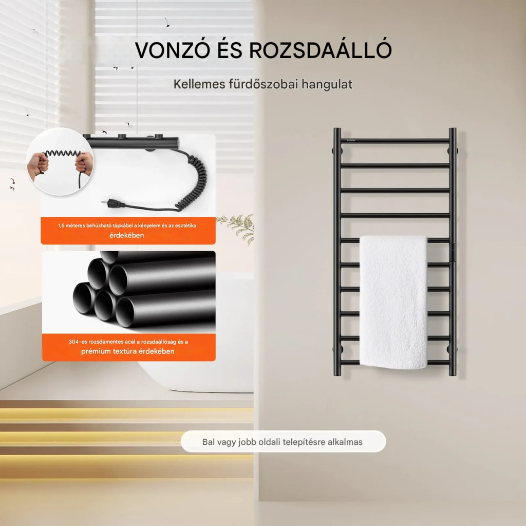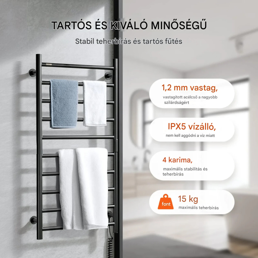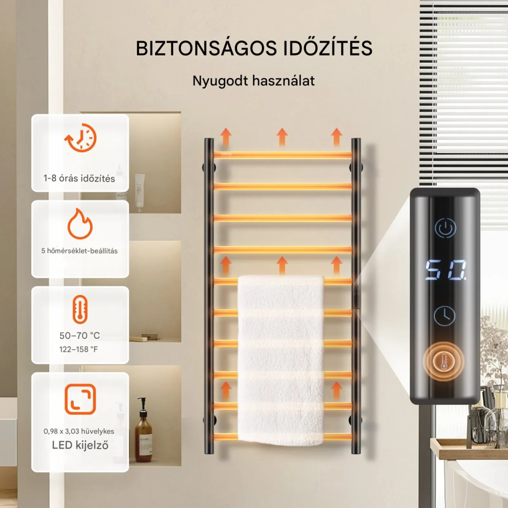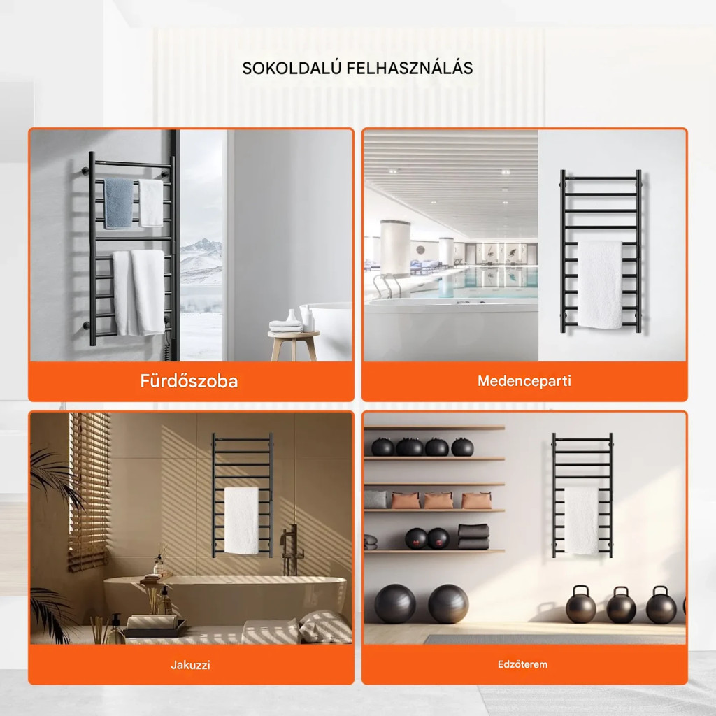 Elektromos törölközőszárító radiátor 10 rudas fkete színű falra szerelhető LED kijelzővel és időzítővel
