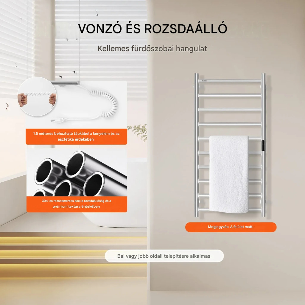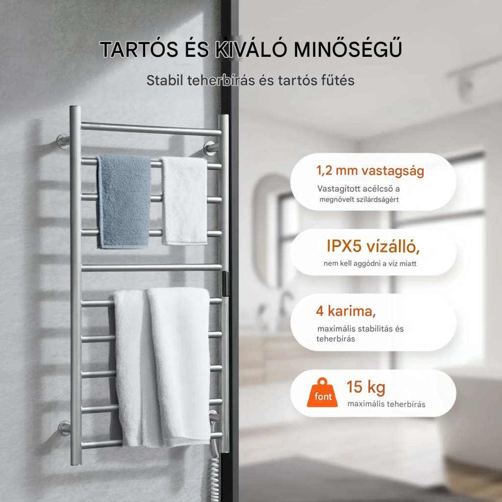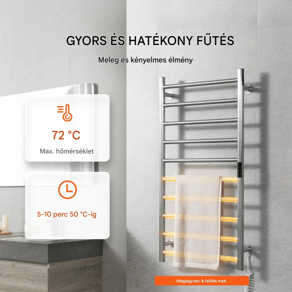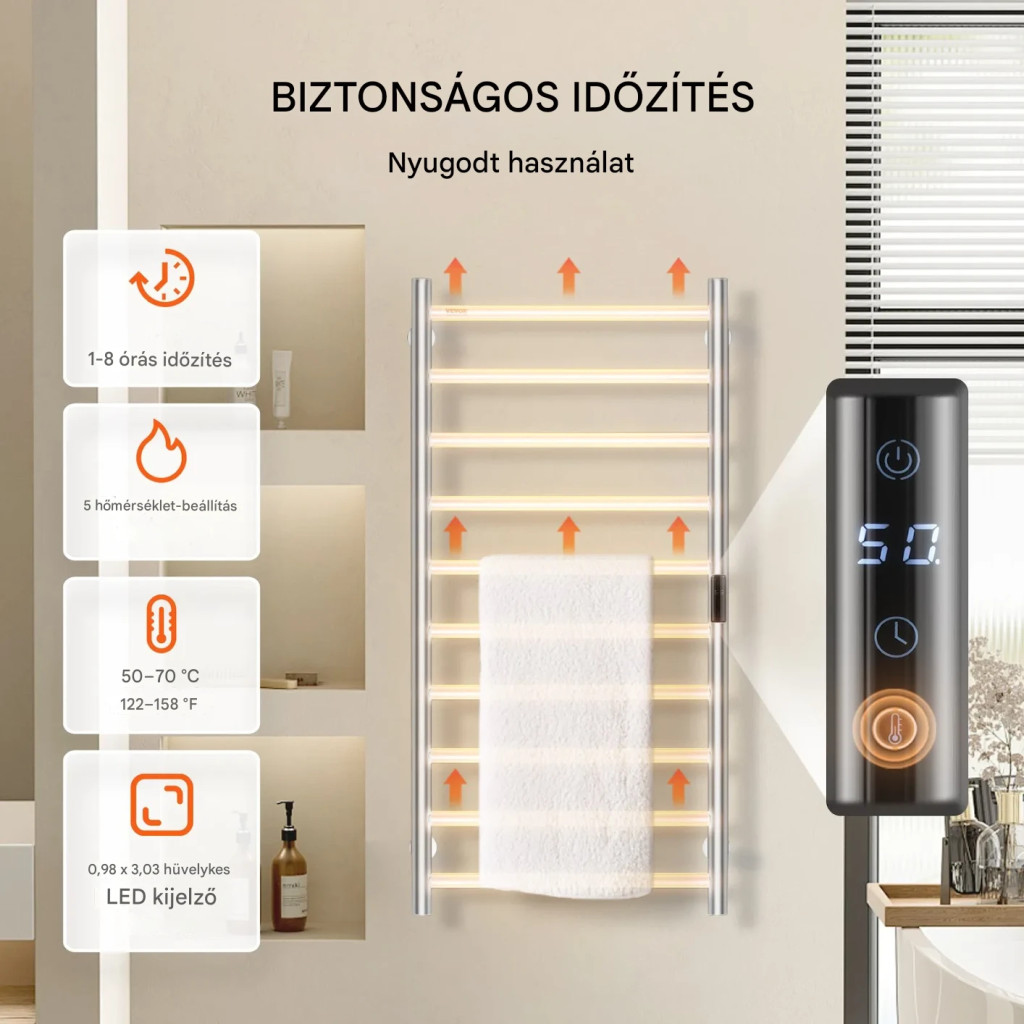 Elektromos törölközőszárító radiátor 10 rudas ezüst színű falra szerelhető törölközőmelegítő LED kijelzővel időzítővel 50-70°C