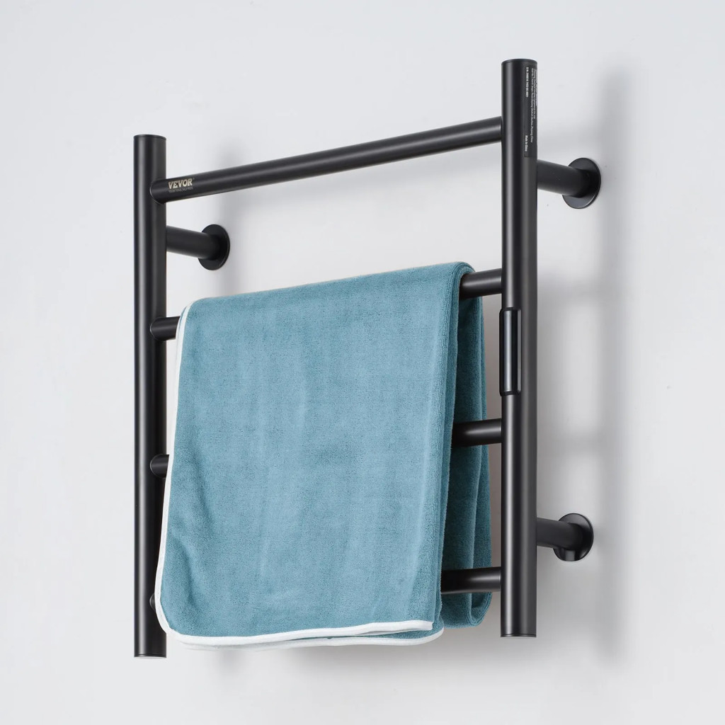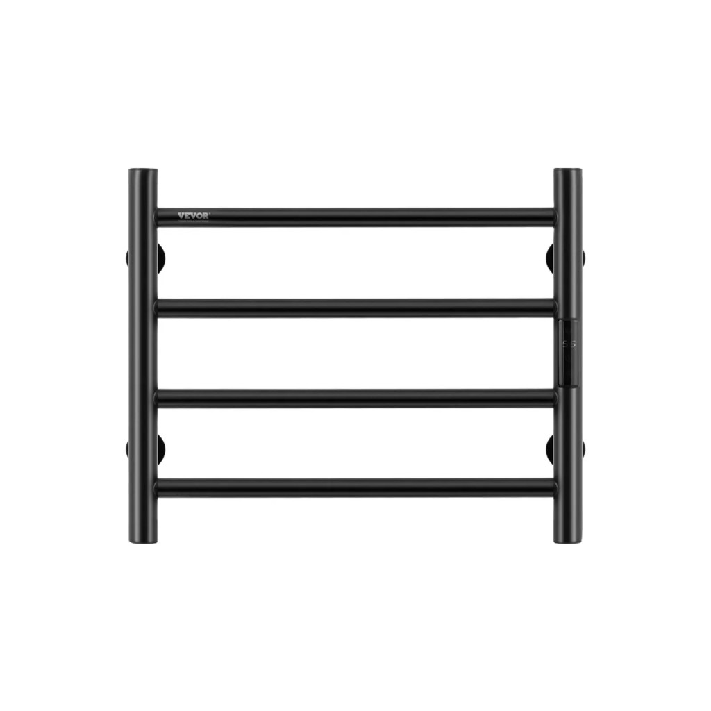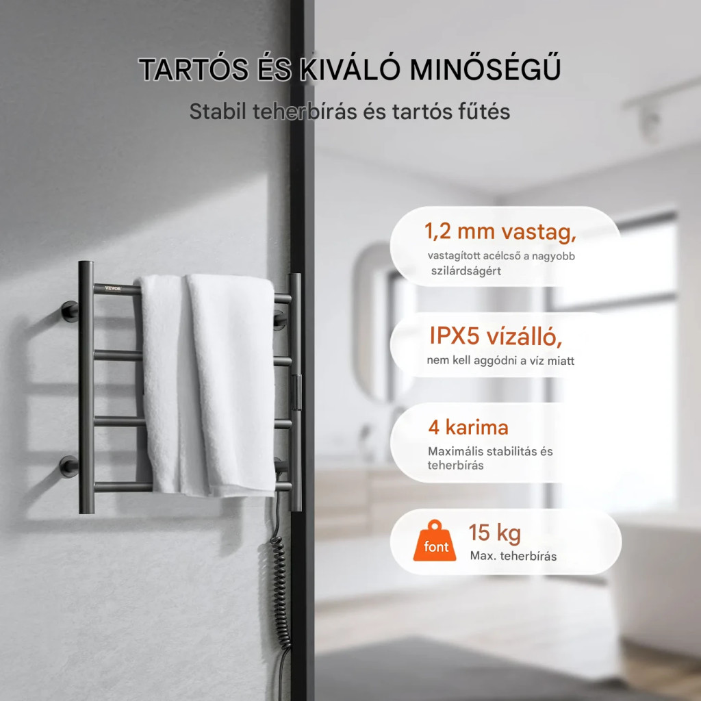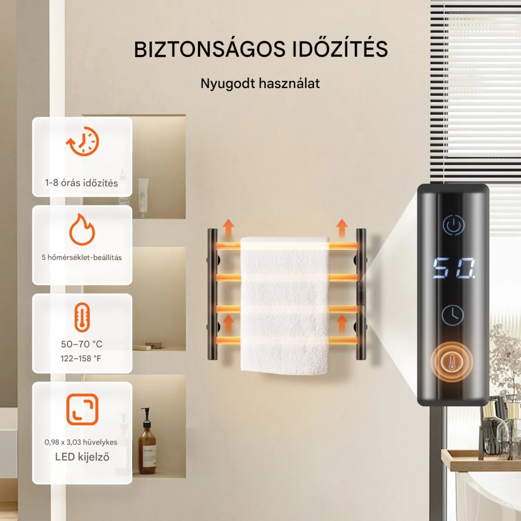 Elektromos törölközőszárító radiátor 4 rudas, falra szerelhető, fekete színű – LED kijelzővel és időzítővel