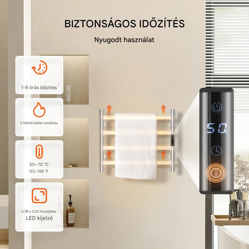 Elektromos törölközőszárító radiátor 4 rudas, falra szerelhető, ezüst színű – LED kijelzővel és időzítővel
